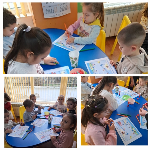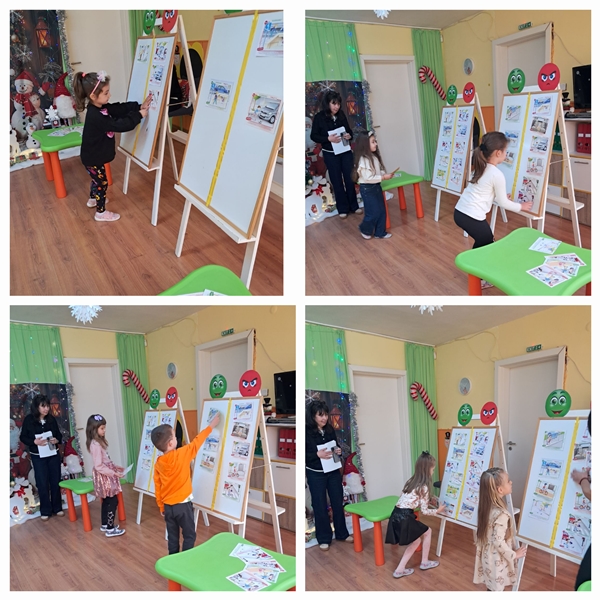 Децата демонстрираха знанията си да разпознават предмети и обекти, свързани с пътната среда. Запознаха се с основни правила за пресичане на кръстовище, с регулировчика и подаваните от него сигнали.
