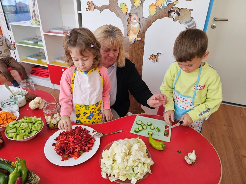 Баба Таня и малките майстори на туршии нарязаха и подредиха в бурканите зеле, чушки, моркови, карфиол, краставици и подправки. Останалите зеленчуци от опитното поле нарязаха, за да се почерпят с вкусна и здравословна салата.