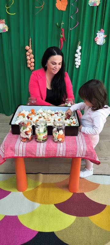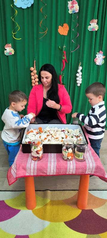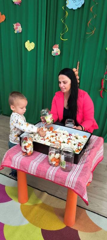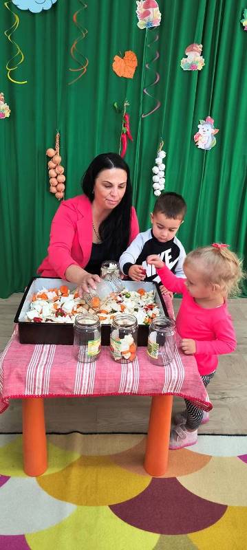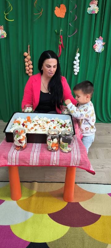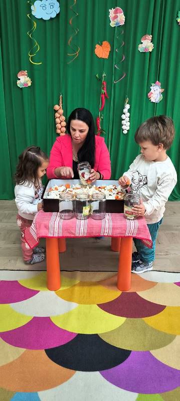 Децата научиха как се пълнят бурканчета с вкусни зеленчуци,а след това всички се събраха около масата и с помощта на баба Ади направиха  туршия.
