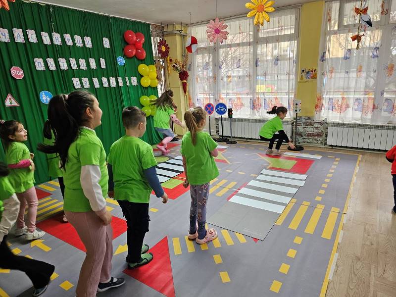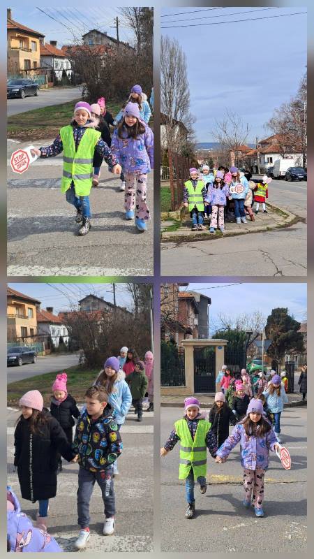 Седмицата започна с практическа насоченост на обучението по БДП, чрез разходка по улицата и посещение на кръстовище под надслов "Пресичай правилно!". Затвърдиха знанията си за правилно пресичане, разпознаване на пътни знаци и безопасно поведение като пешеходци и пътници.
