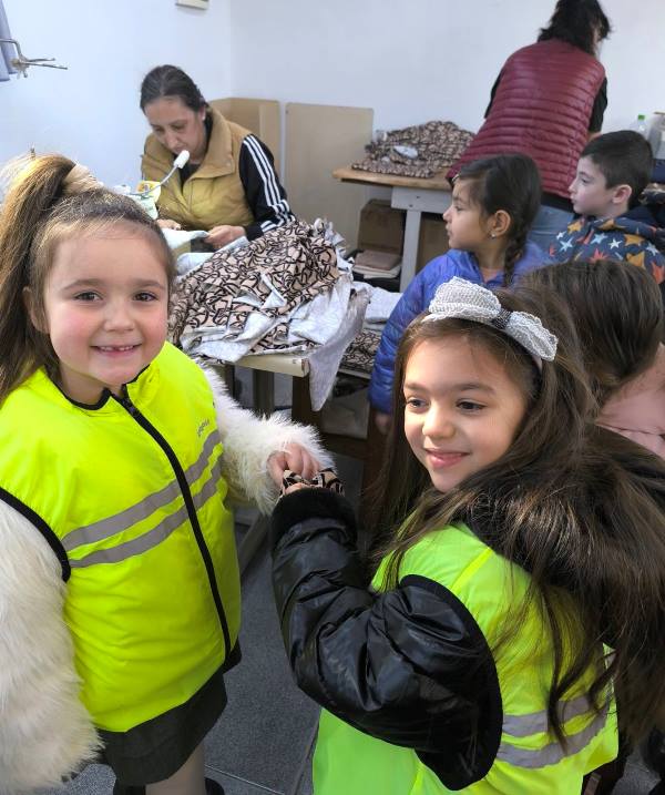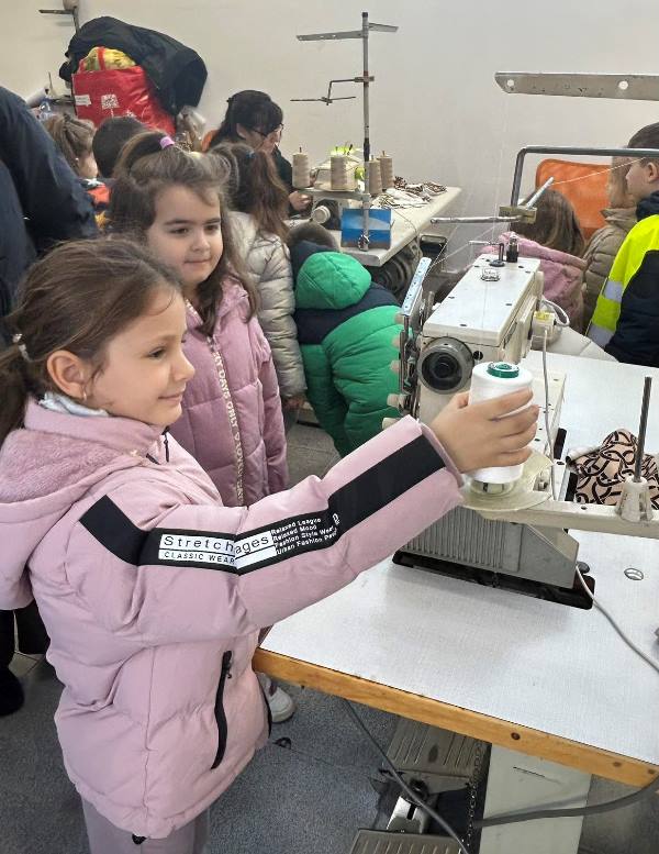 С голям интерес децата разгледаха различни видове платове и кожа, докоснаха ги, сравниха ги по цвят, мекота и здравина. Работниците в цеха им показаха основни инструменти и машини и обясниха по достъпен начин как от едно парче плат се създава готов продукт.