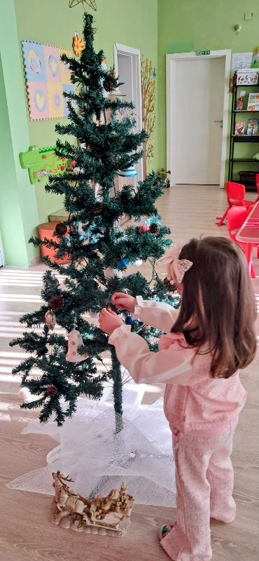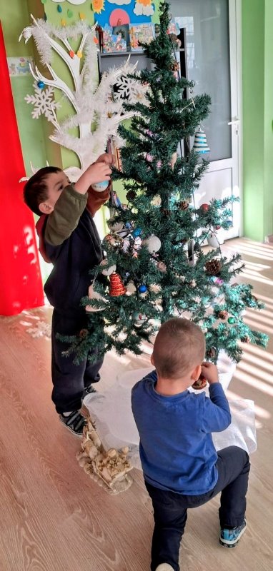 С настъпването на светлите празници Коледа и Нова година, децата от група "Мечо" с много усърдие и искрена радост, украсиха своята елхичка с блестящи гирлянди, цветни украшения и красиви играчки.