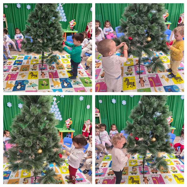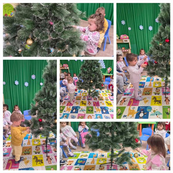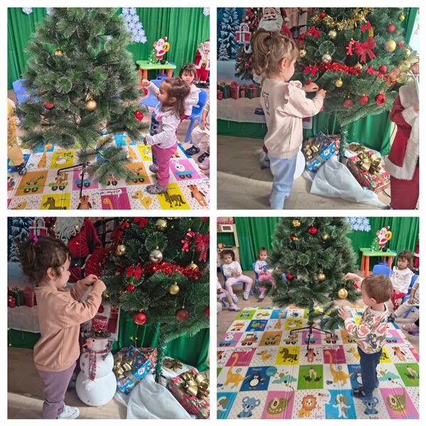 Децата с много вълнение и усмивки украсиха елхата с пъстри гирлянди, снежинки и блестящи играчки. В занималнята засияха светлини, а детските сърца забиха в очакване на Дядо Коледа.