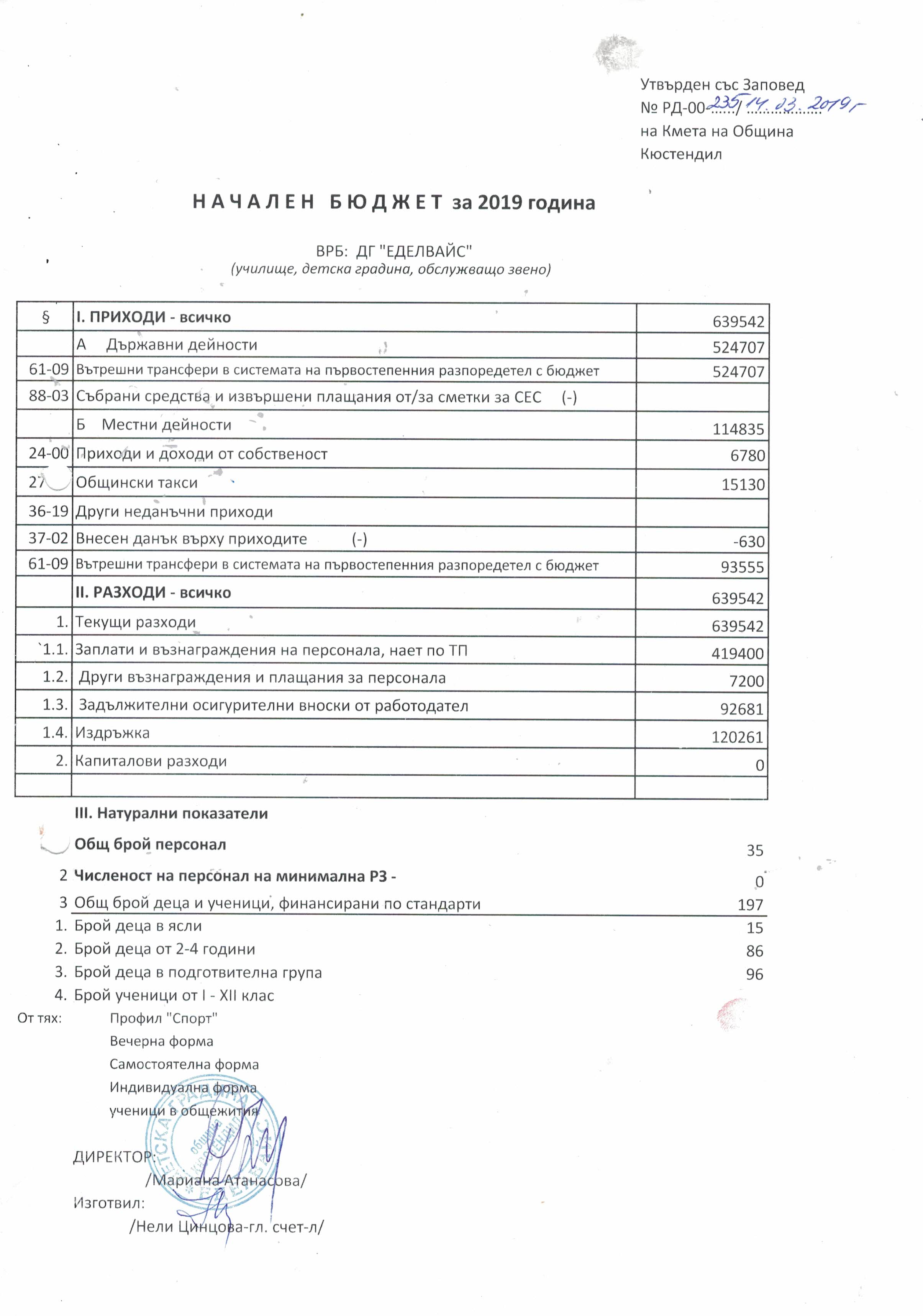 ДГ "Еделвайс" Кюстендил - Начален бюджет 2019 г.