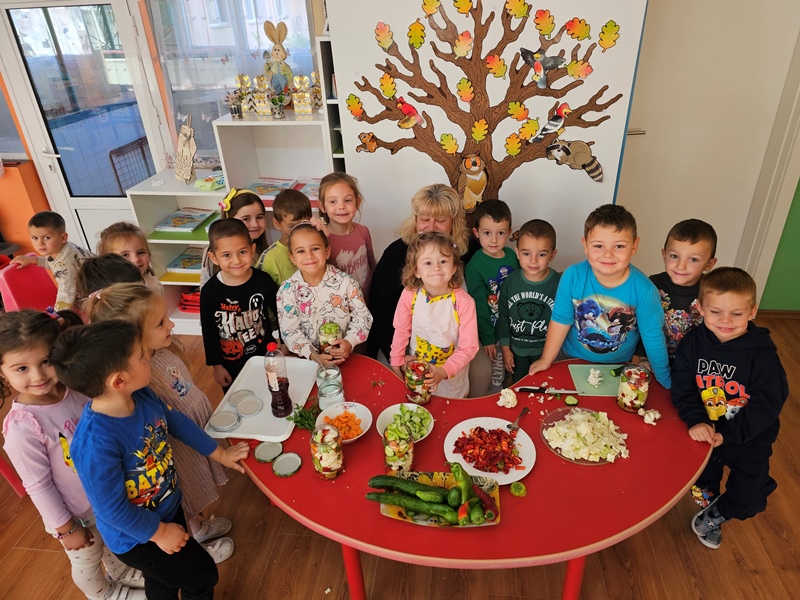 Баба Таня и малките майстори на туршии нарязаха и подредиха в бурканите зеле, чушки, моркови, карфиол, краставици и подправки. Останалите зеленчуци от опитното поле нарязаха, за да се почерпят с вкусна и здравословна салата.
