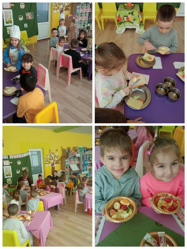 Във втория ден децата от трите групи с много желание и ентусиазъм се включиха в изработването, подреждането и декорация на здравословни сандвичи и плодова салата.