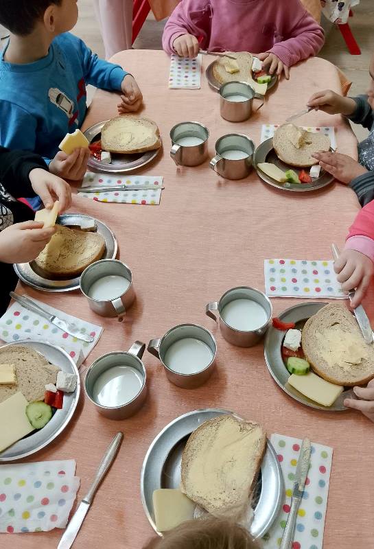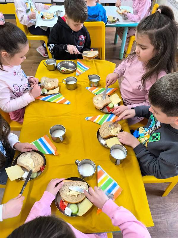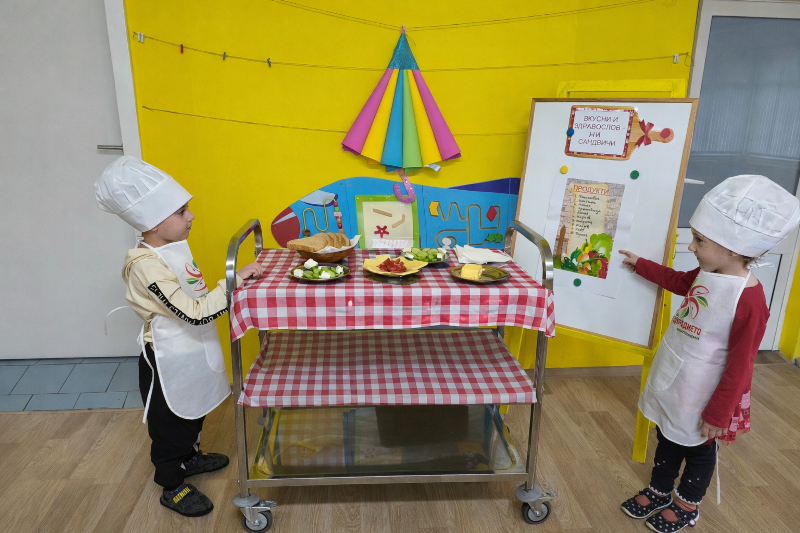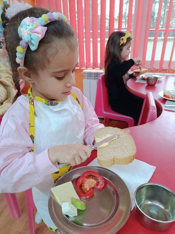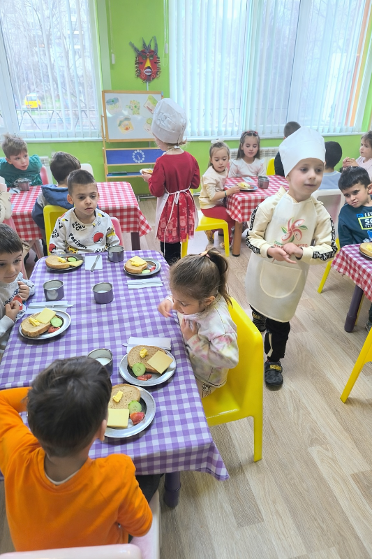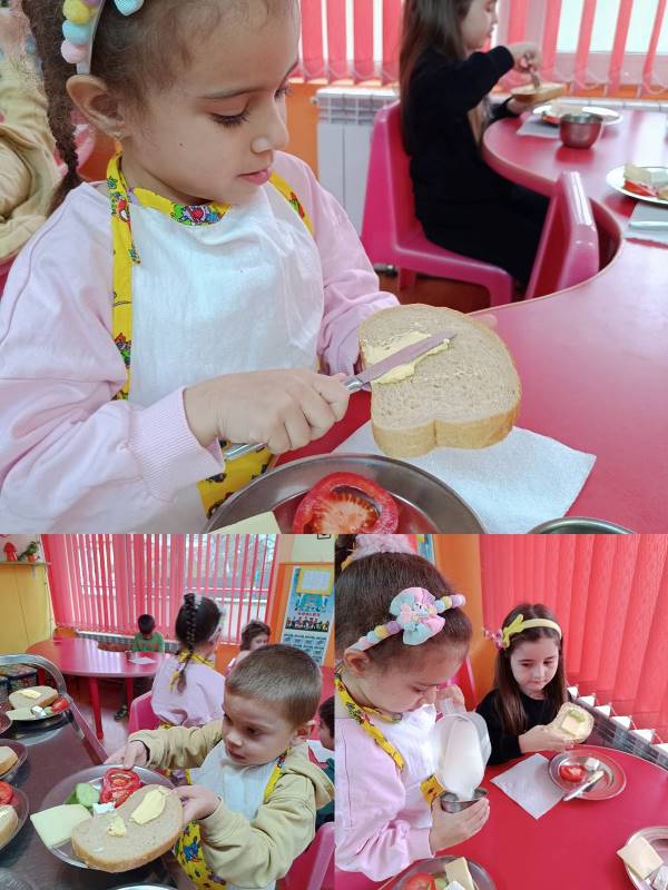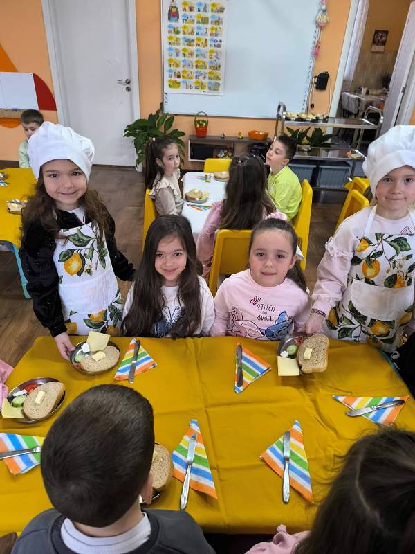 Децата от всички групи ежемесечно приготвят здравословни сандвичи като прилагат усвоените умения за изработване, подреждане и декорация на сандвичи по време на сутрешната закуска.