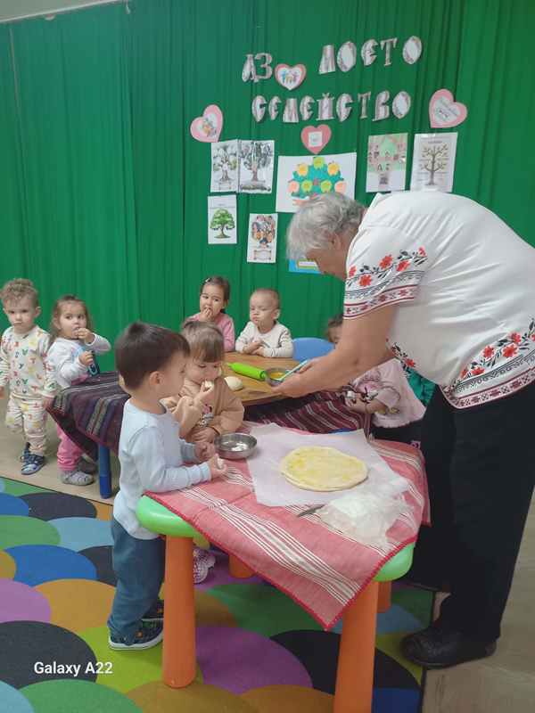 На гости на децата беше леля Васето от НЧ"Светлина-1871".С бодрия си дух и усмивка тя им разказа за най-важните семейни ценности, които определят нашата идентичност, принадлежност и цел.Любовта, уважението, взаимното разбиране, честността, почтеността, вярата и отговорността са сред най-важните.Изпя им песни ,които са пеели нейните родители и показа на децата как се замесва традционна содена питка.Малките щурчета наблюдаваха с огромен интерес и участваха в приготвянето на питката.