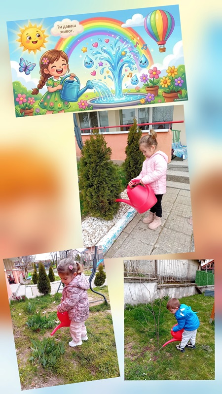 На 18 март 2026г.децата от група „Ежко“отбелязаха "Денят на водата",като станаха истински градинари! С лейки в ръце те поливаха цветята и дръвчетата в двора и се забавляваха от сърце.