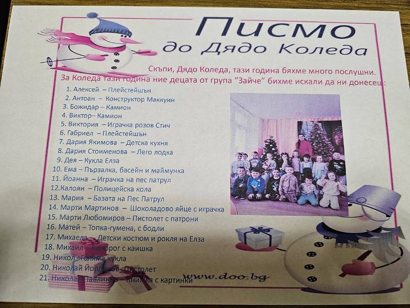 благодарим ти за подаръка от миналата Коледа. Тази година ние децата от група "Зайче" бяхме послушни и добри.