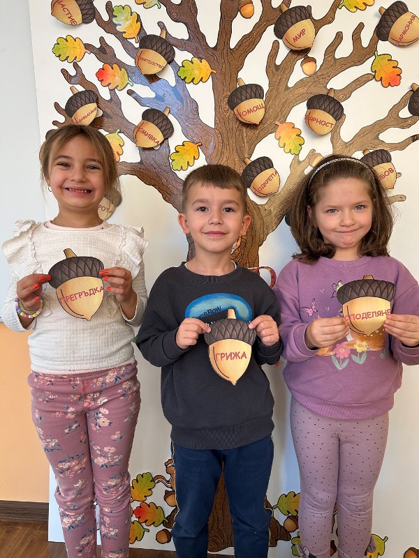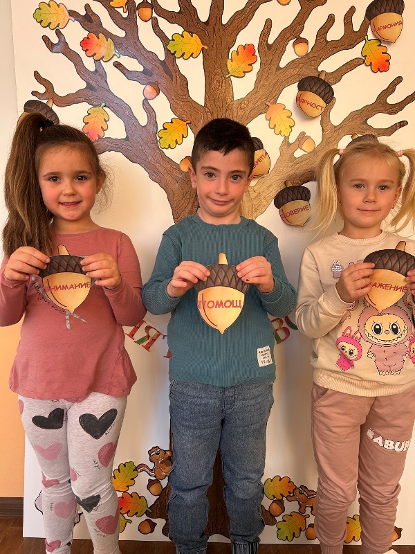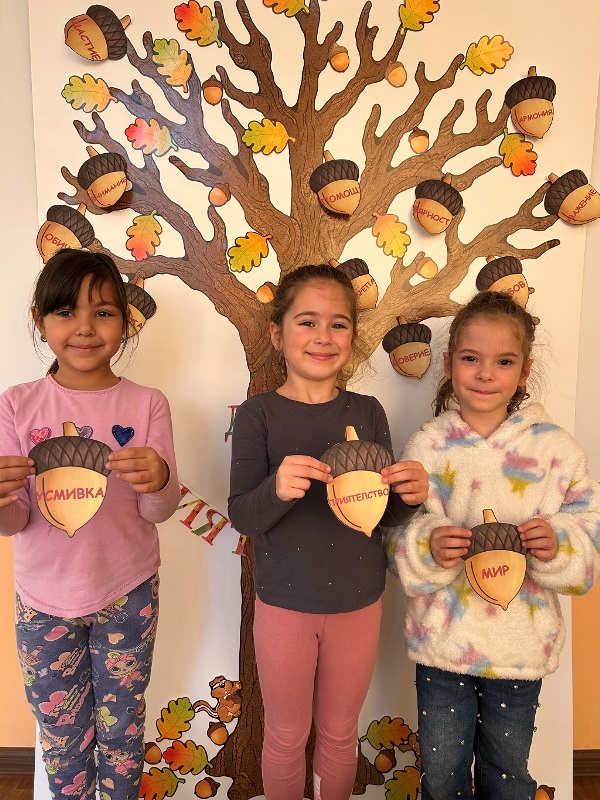 Всяко дете постави свое „жълъдче на добрината“ върху дървото, изразявайки по този начин желание за повече усмивки, разбирателство и обич между всички. Инициативата насърчава децата да бъдат внимателни едни към други, да приемат различията и да поддържат дух на сътрудничество в групата.