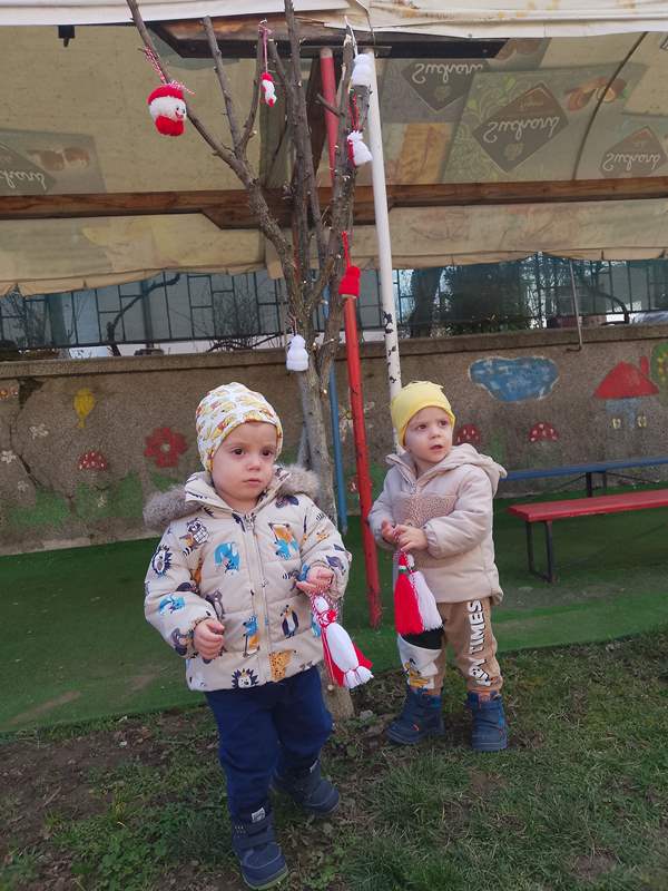 Малчуганите от група "Калинка" украсиха с мартенички свое мартенско дърво в двора на детската градина.